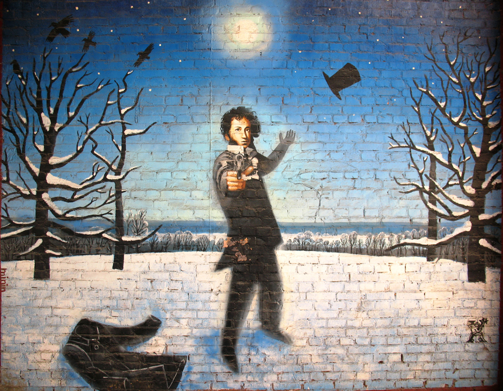 Ein Graffiti in der Puschkin-Straße 69 in Charkiw (Ukraine): Der große russische Dichter zielt hier nicht auf Dantes, sondern auf Hollywood-Helden wie Superman, Darth Vader und Arnold Schwarzenegger. Quelle:V. Vizu / wikimedia.org